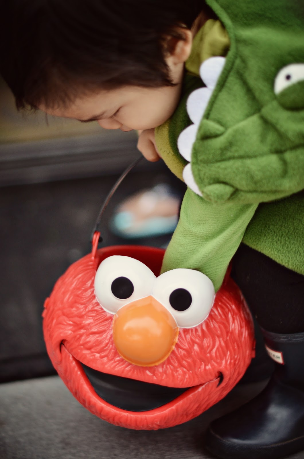 We made a brief trip around the neighborhood yesterday so that Jace (our baby dino) could experience some trick-or-treating. Fortunately for us, he's not into candy just yet (knock on wood). He was much more into the Cheerios that we put into his Elmo bucket, so he would hold the darn thing! :) Nonetheless, I think he really enjoyed walking around the area and meeting our friendly neighbors.